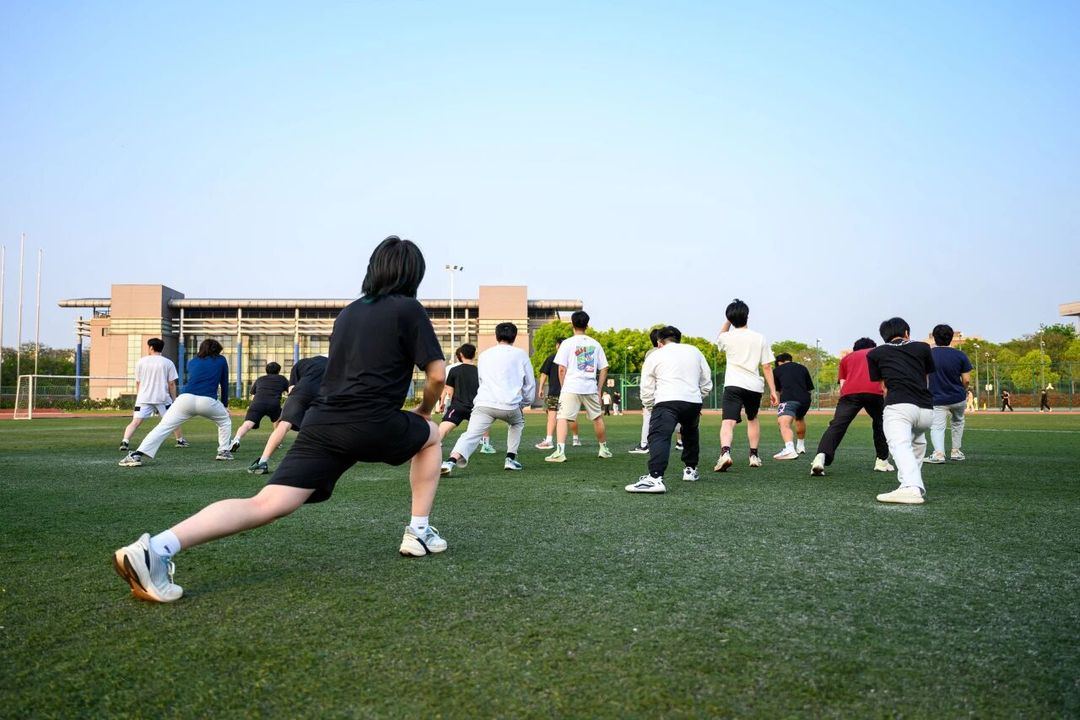 训练场上,大家练得很认真。有人帮你压肩,有人帮你计时,跑完长跑有人递水。那些拉伸过的肌肉,滴落在跑道上的汗水,一点一点地把“脆皮大学生”进化成“铠甲勇士”。
