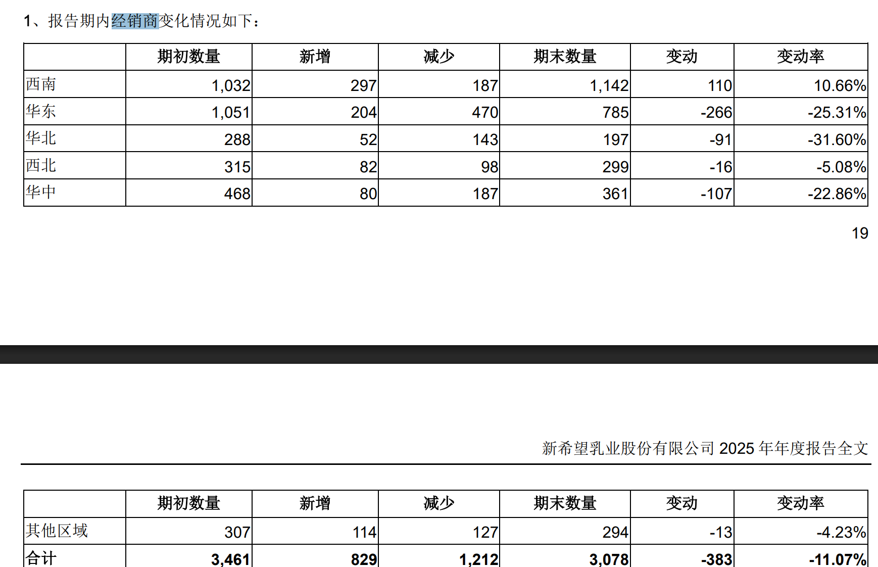 财报中另一个值得关注的点是经销商数量的变化。2025年,日韩+中文+欧美电影新乳业经销商总数从3461家缩减至3078家,净减少383家,降幅超过11%。其中华东区域减少超25%,华北区域更是超过30%。